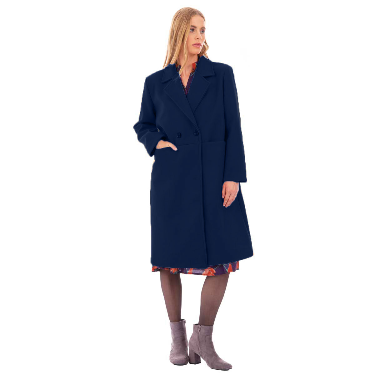 Platinum, διαχρονικό, παλτό σε σκούρο μπλε χρώμα, γυναικείο και γιακά με πέτο. Στο μπροστινό του μέρος, έχει εσωτερικές τσέπες και κουμπώνει με δύο κουμπιά και έχει εσωτερικό κούμπωμα με κουμπί.