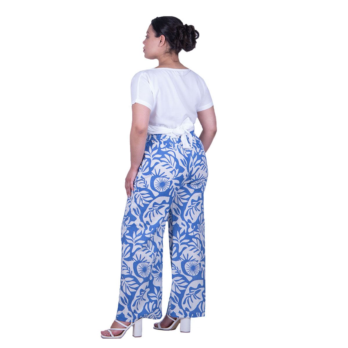 Platinum, νεανική, παντελόνα γαλάζια με λευκά floral, γυναικεία, καλοκαιρινή, βαμβακολινή, φαρδιά, με λάστιχο στη μέση και κορδόνι, αέρινα μπατζάκια και εξωτερικές τσέπες. Φοριέται όλη τη διάρκεια της ημέρας.