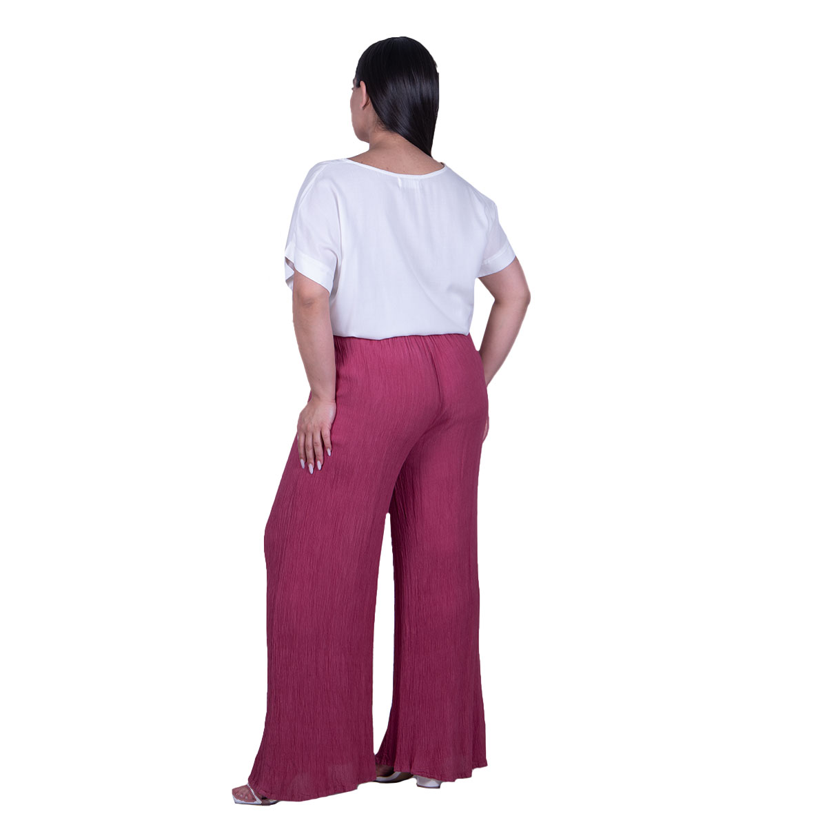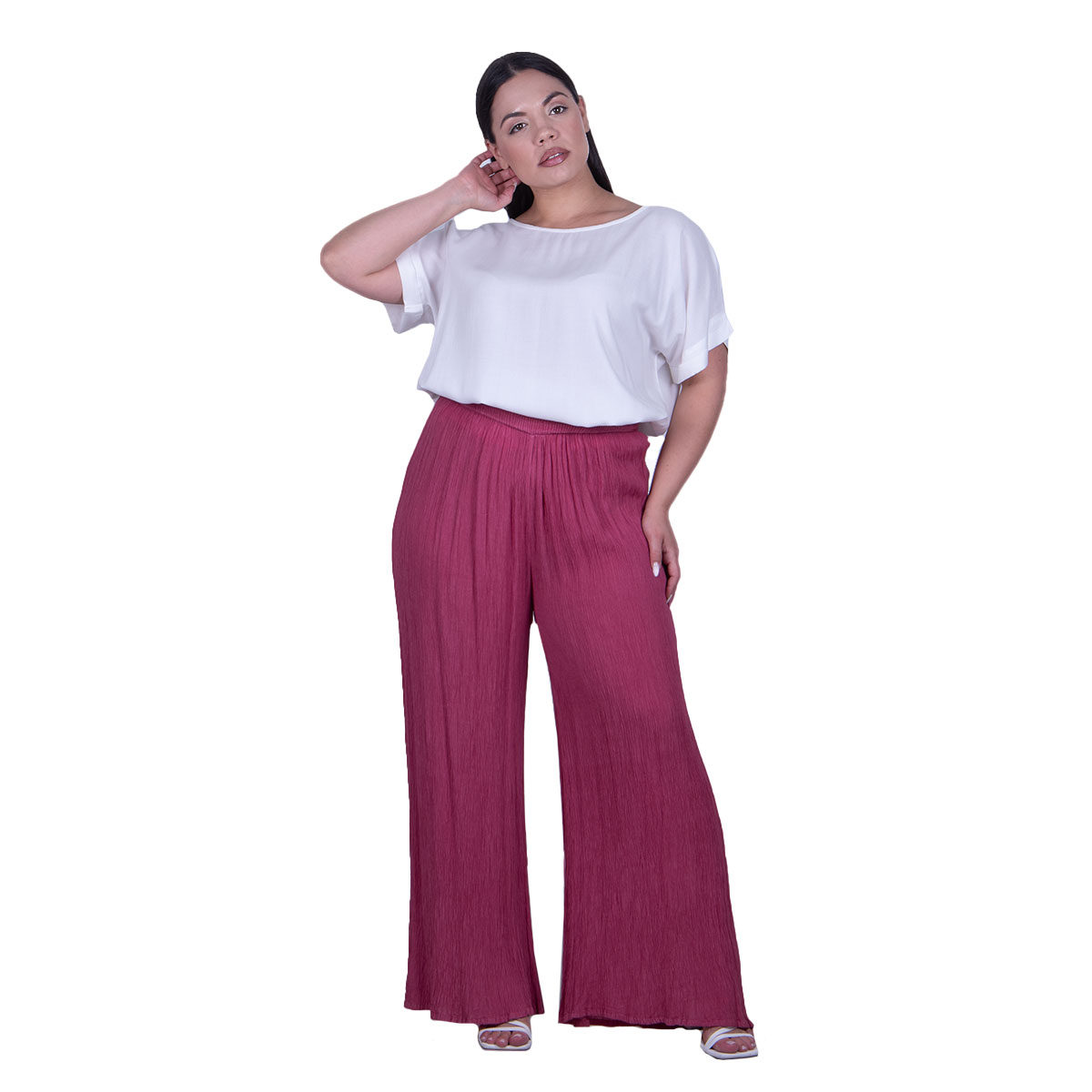 Platinum, δροσερή, παντελόνα ροδί, ατσαλάκωτη, γυναικεία, καλοκαιρινή, καθημερινή, με μικρό λάστιχο σφηκοφωλιά στη μέση. Άριστης ποιότητας και ιδιαίτερα φιλικό με το δέρμα μας.