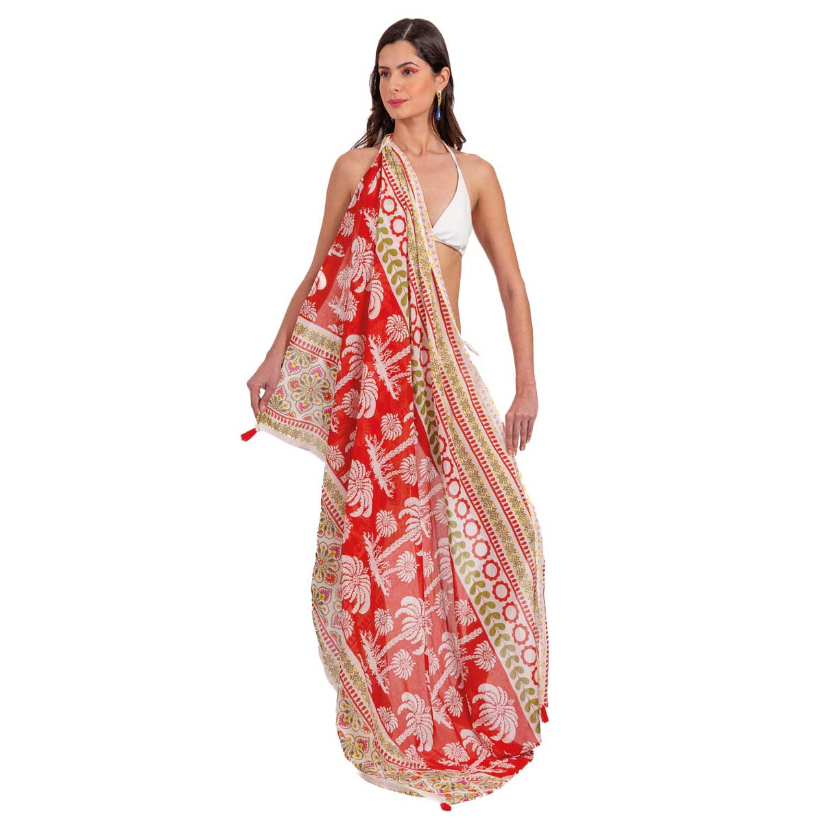 Platinum, δροσερό, παρεό – μαντήλι κοραλί, με σχέδια από φοίνικες, γυναικείο και καθημερινό. Εντυπωσιακό και αέρινο ! Κολακεύει όλα τα γυναικεία σώματα!