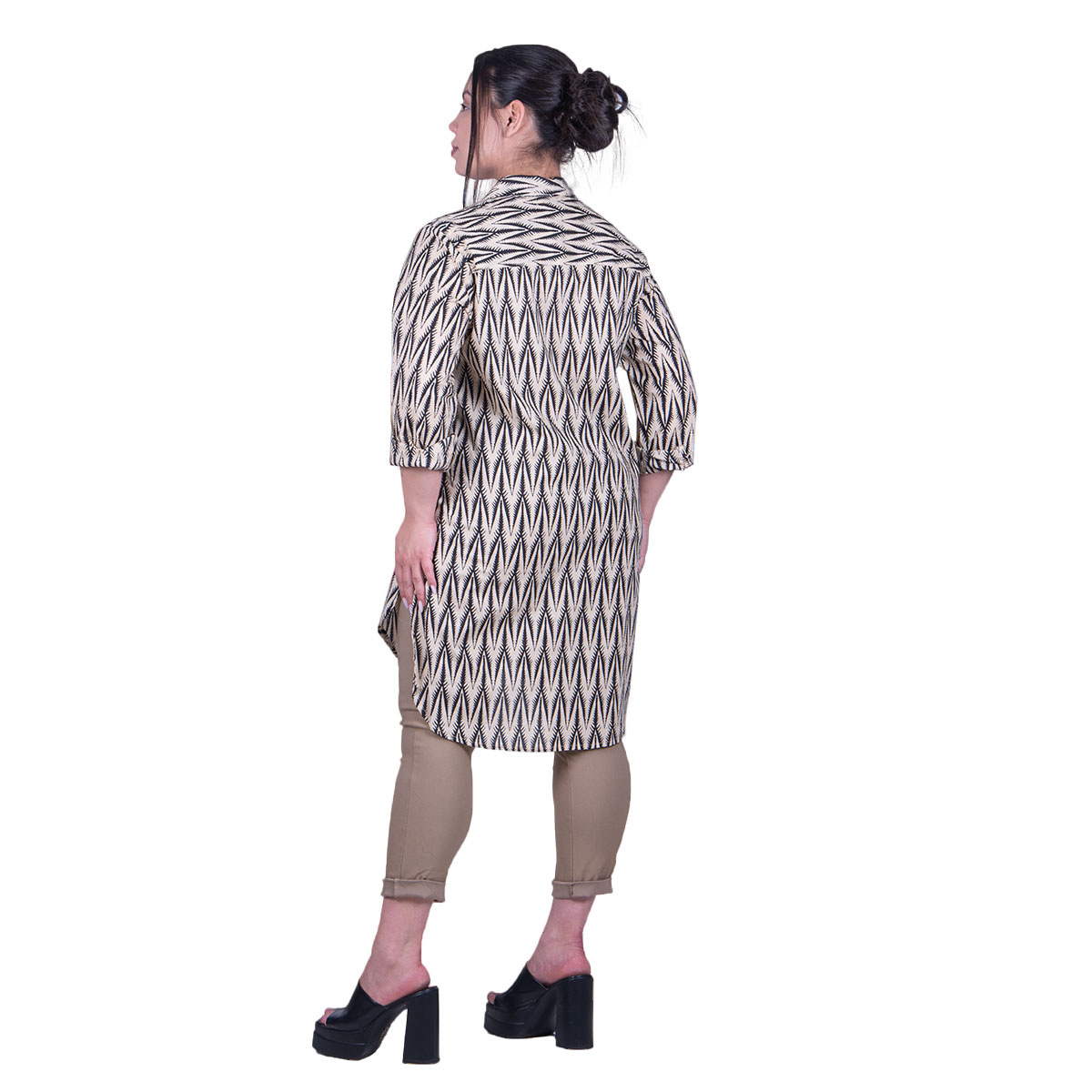 Platinum, δροσερή, πουκαμίσα εκρού με μαύρα print, γυναικεία, με γιακά, μακριά μανίκια, μικρή ασυμμετρία στο τελείωμά της και κλείνει με 9 κουμπιά. Αριστερά στο μπούστο έχει μια εξωτερική τσέπη. Στα τελείωμά του στα πλαϊνά του έχει ανοίγματα. Κολακεύει όλα γυναικεία σώματα!