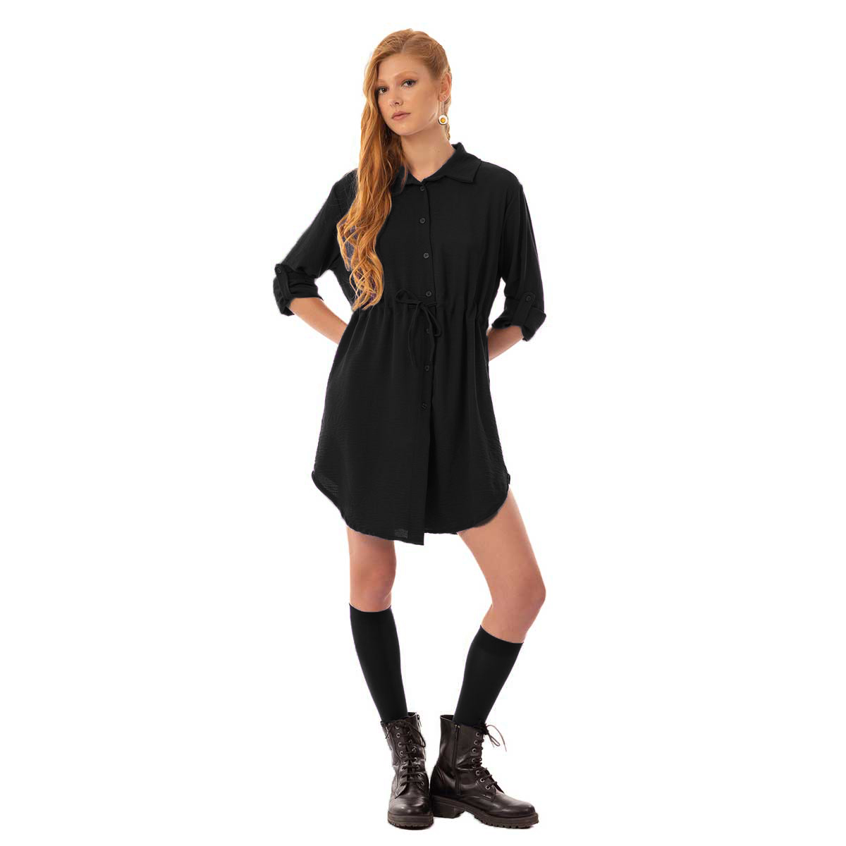 Platinum, νεανικό, πουκαμίσα – φόρεμα μαύρη, γυναικεία, σεμιζιέ, με εσωτερική ζώνη και μανίκια αναδιπλώμενα με κουμπί. Κλείνει με 8 κουμπιά.