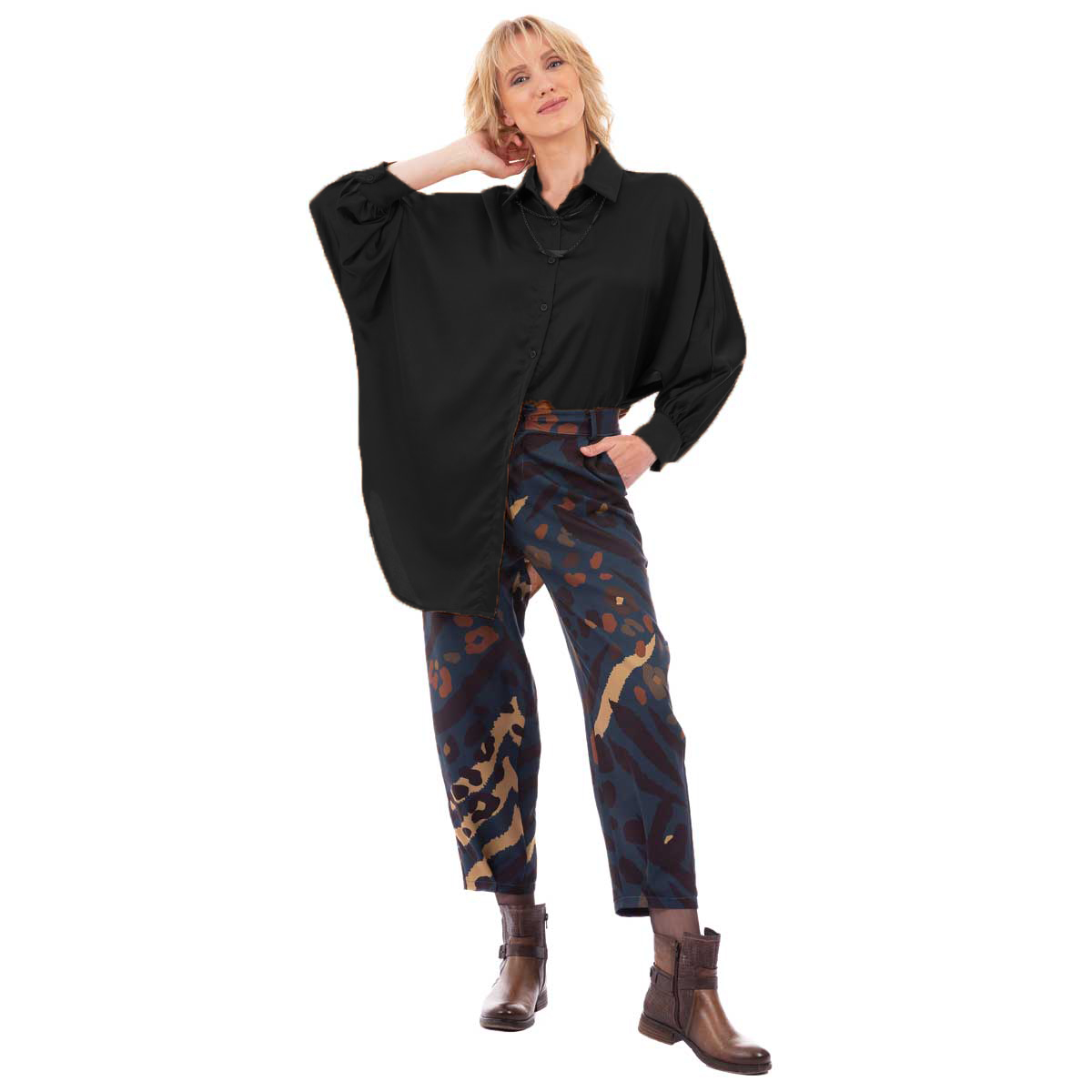 Platinum, νεανικό, πουκαμίσα μαύρη, γυναικεία, καθημερινή, σατινέ, μακριά με γιακά, μακρυμάνικη, χωρίς μανικοκόλληση, στυλ νυχτερίδα, με φαρδιά μανσέτα που κλείνει με κουμπί, ασυμμετρία με στρογγυλάδα στο τελείωμα του και έχει 7 κουμπιά στο κλείσιμό του. Ένα καλοδιαλεγμένο πουκάμισο, που μπορεί να φορεθεί ως casual με τζιν μέχρι και με κομψά business παντελόνια και φούστες. Απλό και όμορφο σχέδιο!