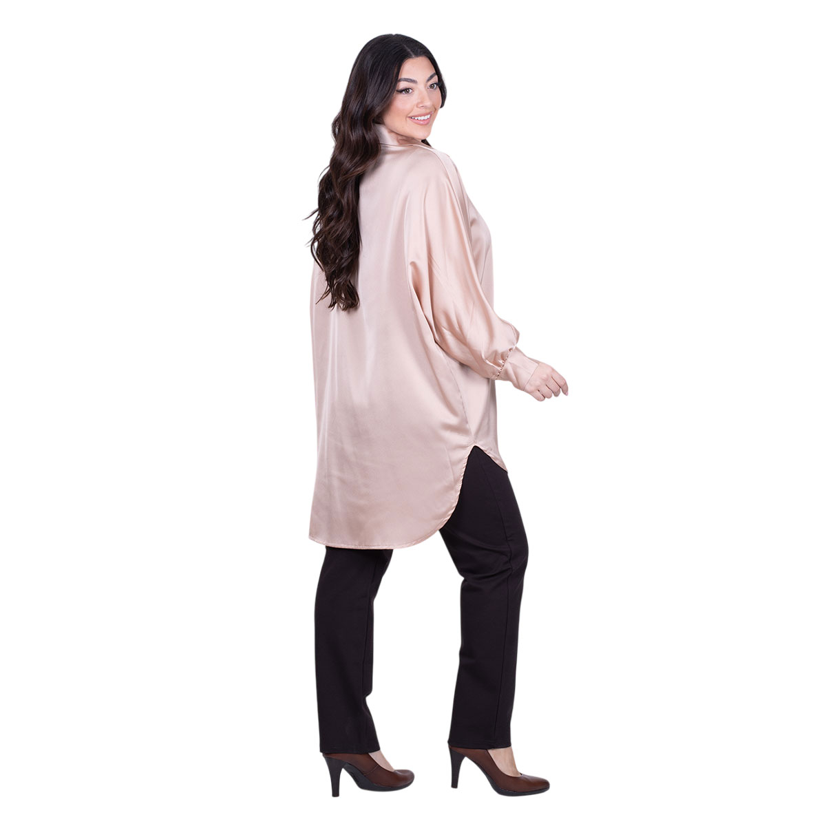 Platinum, νεανικό, πουκάμισα nude, γυναικεία, καθημερινή, σατινέ, μακριά, με γιακά, μακρυμάνικο χωρίς μανικοκόλληση, στυλ νυχτερίδα. φαρδιά μανσέτα που κλείνει με κουμπί, ασυμμετρία με στρογγυλάδα και κλείνει με 7 κουμπιά. Ένα καλοδιαλεγμένο πουκάμισο, που μπορεί να φορεθεί ως casual με τζιν μέχρι και με κομψά business παντελόνια και φούστες. Απλό και όμορφο σχέδιο!