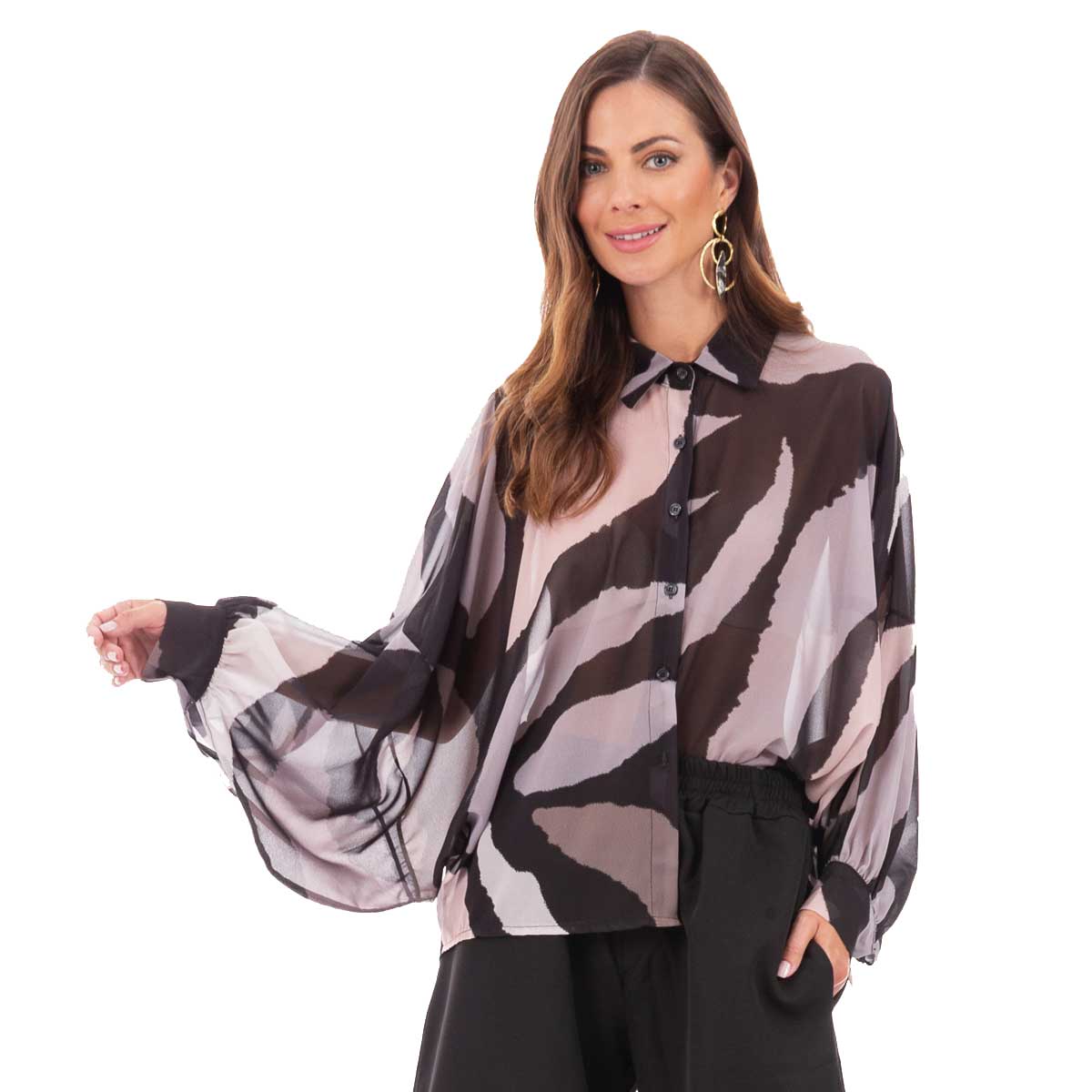 Platinum, νεανικό, πουκάμισο μαύρο, με σομον και nude σχέδια, γυναικείο, καθημερινό, με γιακά, ιδιαίτερα μακριά φαρδιά μονοκόμματα μανίκια, στυλ νυχτερίδας, που κλείνουν με κουμπί. Στο τελείωμα του έχει μικρή ασυμμετρία 8 εκατοστών και κλείνει με 6 κουμπιά.