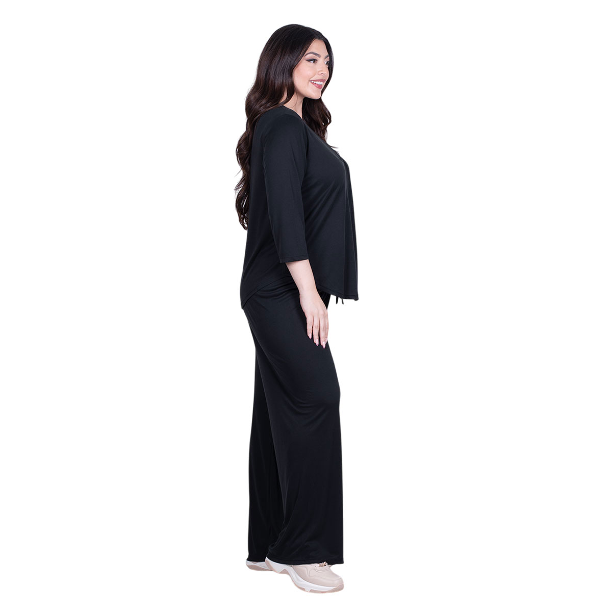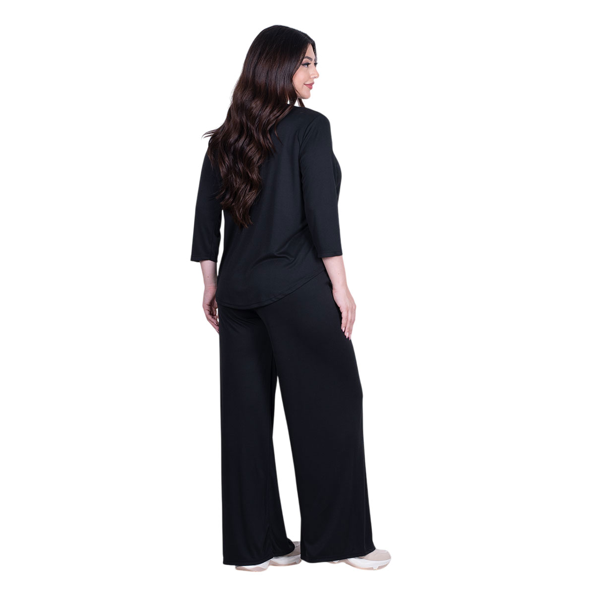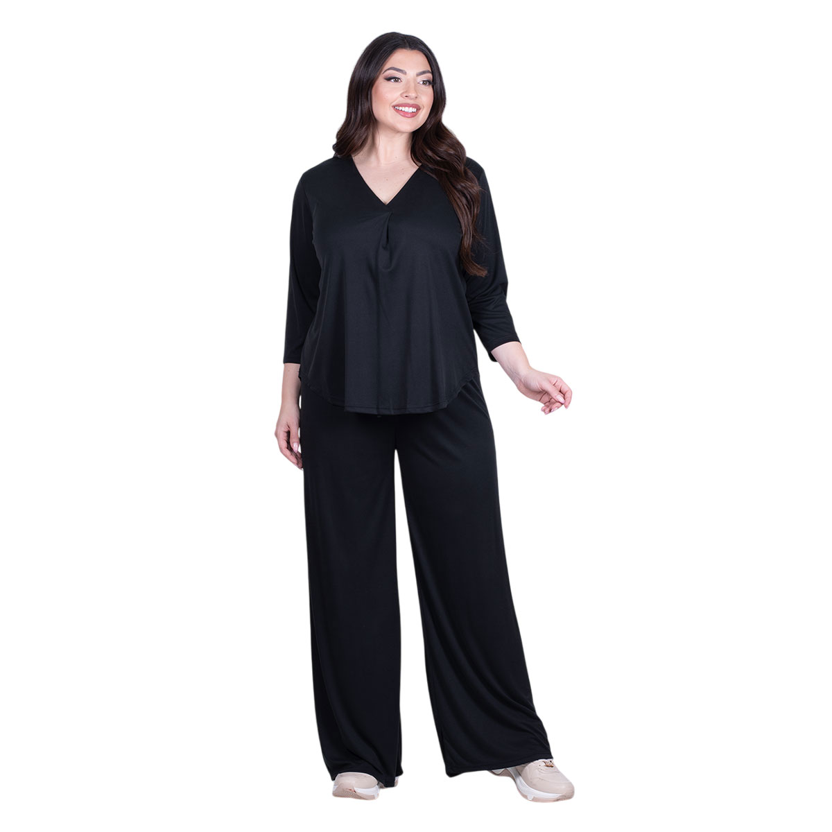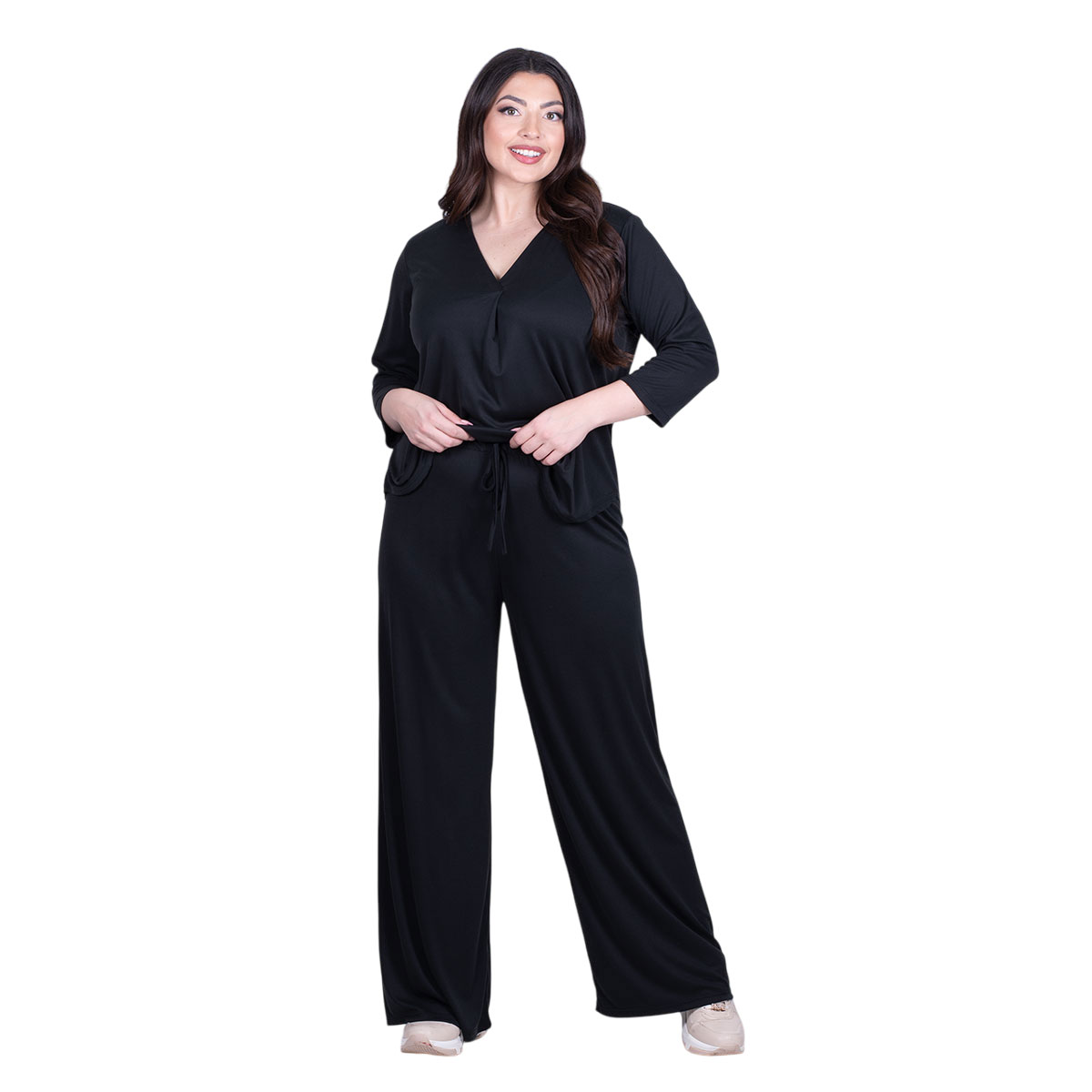 Platinum, καθημερινό, σετ παντελόνα – μπλούζα γυναικείο, μαύρο, χυτό, με άνεση στο σώμα. Η παντελόνα έχει λάστιχο στη μέση και διακοσμητικό κορδόνι. Η μπούζα, έχει V ντεκολτέ, μανίκια τρουακάρ και στο τελείωμα κάνει στρογγυλάδα.