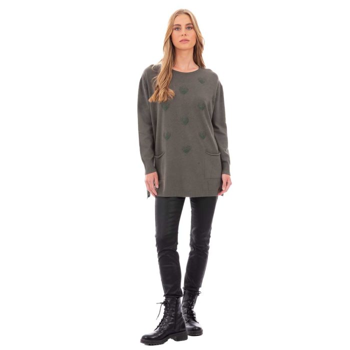 Platinum Μπλούζα Χακί Γυναικεία Μακρυμάνικη Με Τσέπες Καθημερινή ”Καρδιές Strass”- IT- 02942